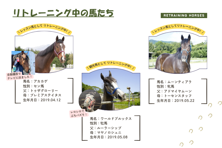 いずれも自社でリトレーニングを行った引退競走馬をメインとした営業となっており、1972年の開業当初から50年以上にわたり、引退競走馬を支える活動を続けてきました。