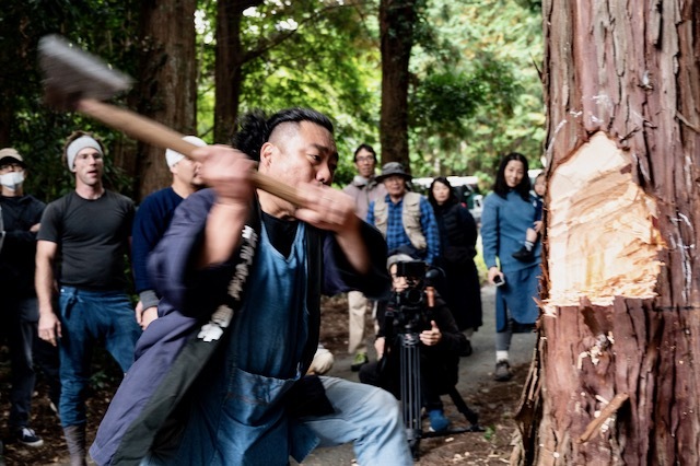 <2020年「ミハシラを建てる」で斧での最初の一太刀を入れる北村裕寿さん>