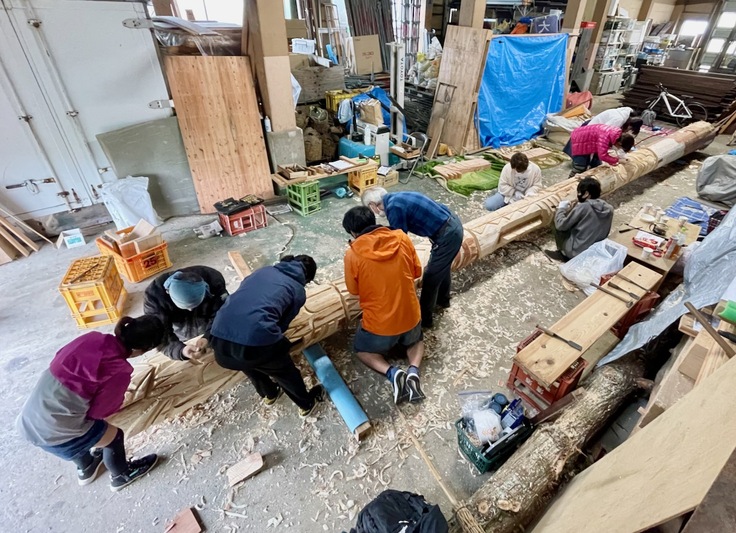 <多くのひとの手で彫ったトーテムポールのワークショップ風景>