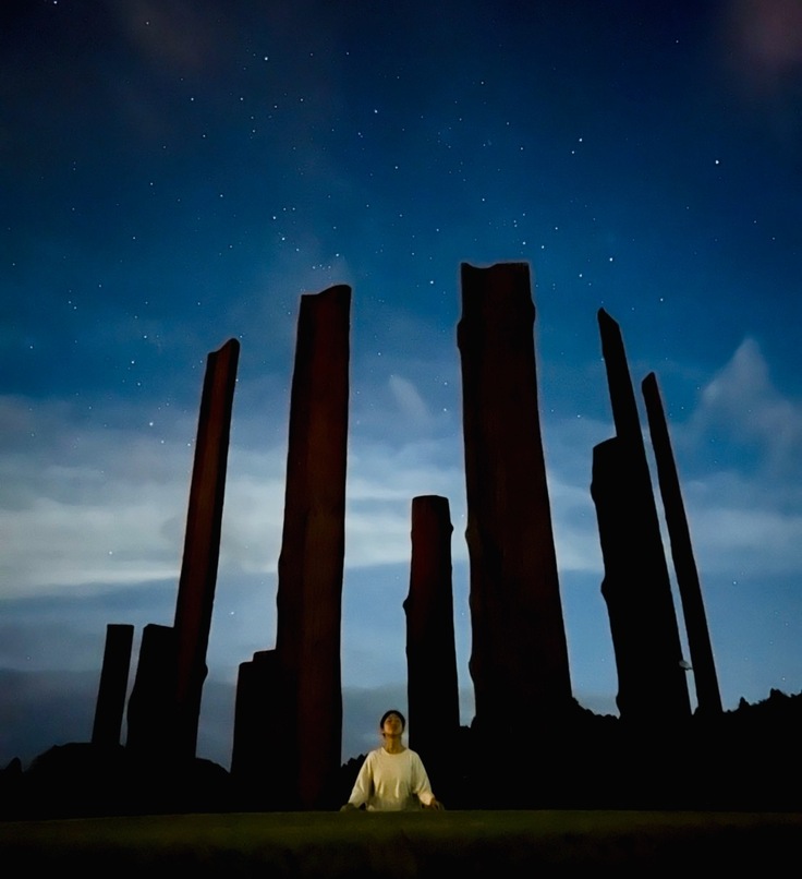 悠久のいのちの顕れでるストーンサークルと限りあるいのちの顕れであるウッドサークル。古代の人々は、陰陽対になったふたつの巨大建造物がイトナミの中にあることで、星の巡りを日々感じ、自分たち取り囲む自然とシンクロした本来のリズムで生きていたのではないか。