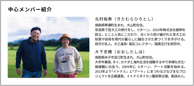 2013年に大山アニメーションプロジェクトからはじまった小さなアートプロジェクトが年々進化を遂げ、自分たちの暮らしの場でイトナミそのものをアートにするをテーマに、 鳥取県の大山の麓でイトナミダイセン藝術祭を主催。今年で6年目を迎えます。
