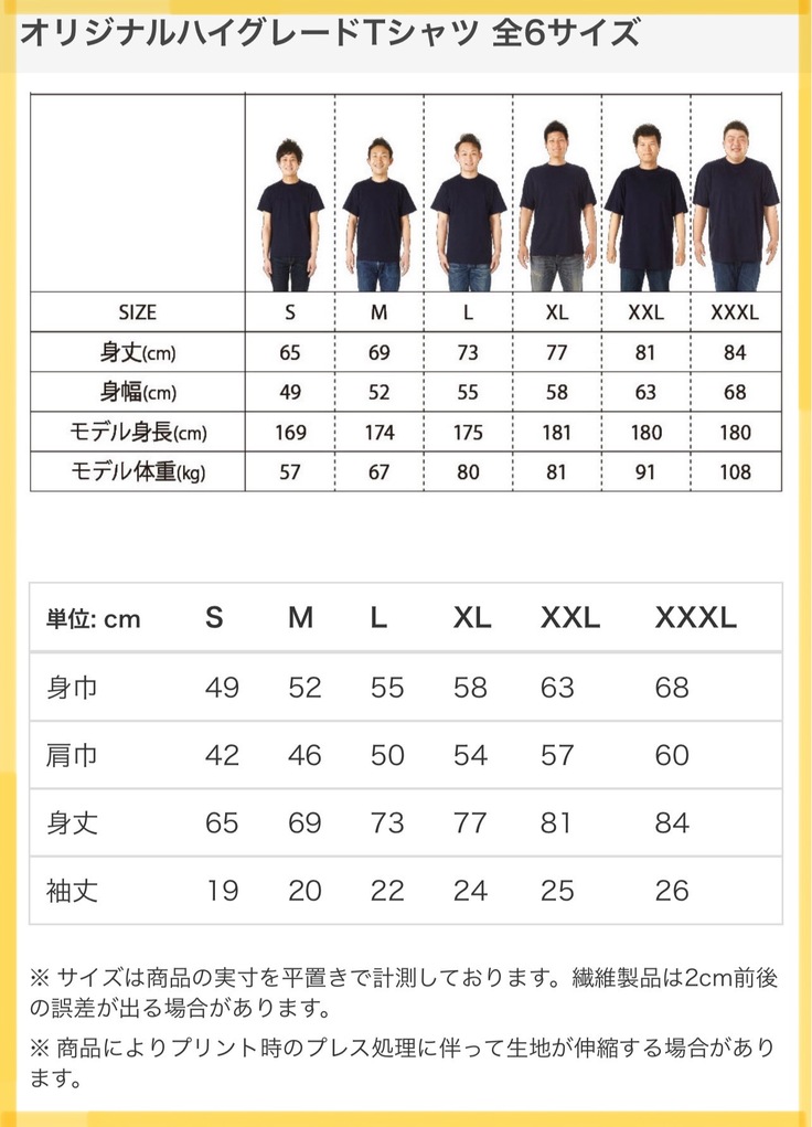 実際のサイズ表が決まったので、改めて下記サイズ表からTシャツサイズを再検討お願いいたします🙇🏼♀️