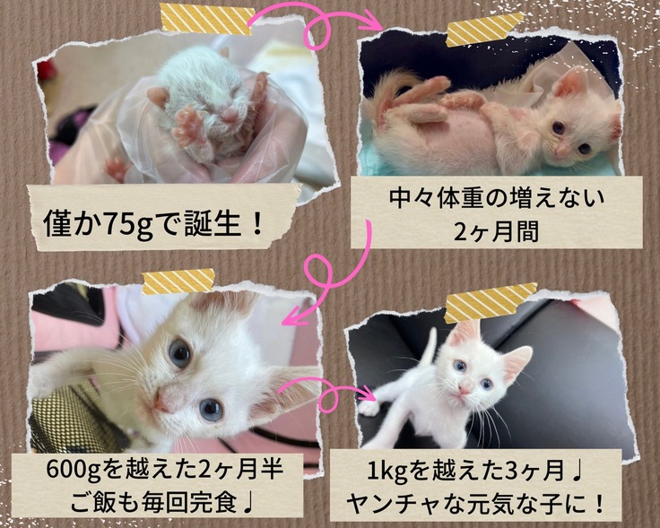 保護したガリガリの白猫ちゃんから保護直後に産まれた75gの子猫ちゃん↓
