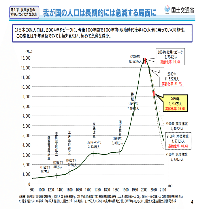 下の図は日本の人口動態なのですが、1900年代に急激に人口が増加、2004年をピークに、また急激に減少していることが分かると思います。