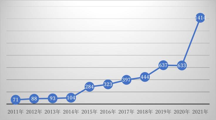 下記は、2011年の開設から2021年までの年間相談件数の推移のグラフです。