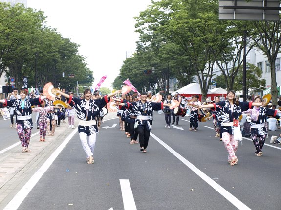 みんなの心を一つにして、法被の翼に夢をのせ、大和撫子と伊達な男達が希望と一緒に舞い踊っています。