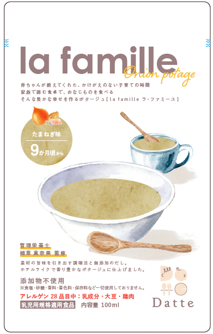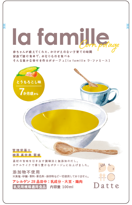 当店オリジナルのポタージュ「la famille ラ・ファミーユ」は、コーンとオニオンの2種類をご用意しました。いずれもレトルトパウチ食品で、加熱調理&レトルト殺菌済みです。水や火を使って調理する必要がなく、そのままでも安心安全に召し上がっていただけます。