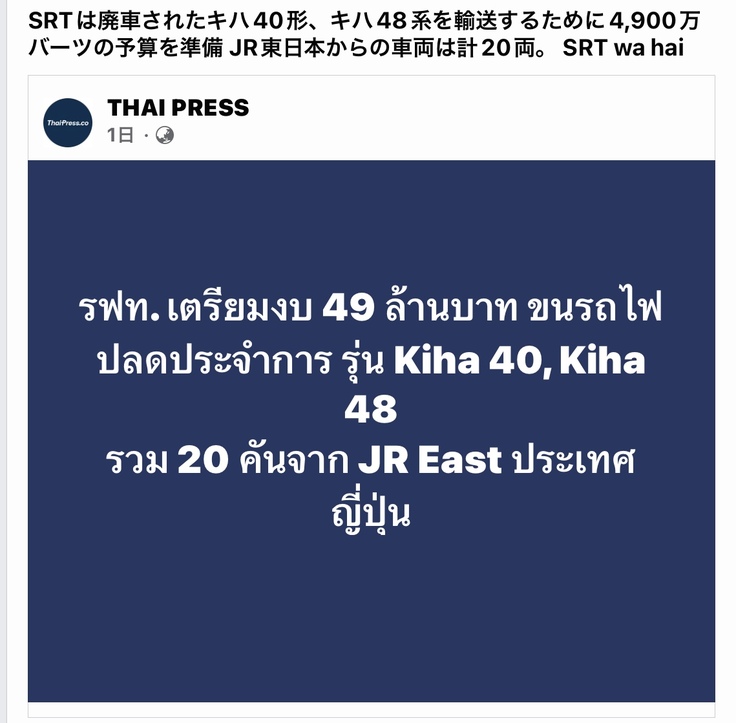 Thai Pressからの転載です、詳細は確認してませんが、タイ国鉄がキハ40/48系を20両JR東日本から購入するそうです。キハ183系、14系(はまなす車)と購入や改造が続き、タイ国鉄から目が離せませんね。