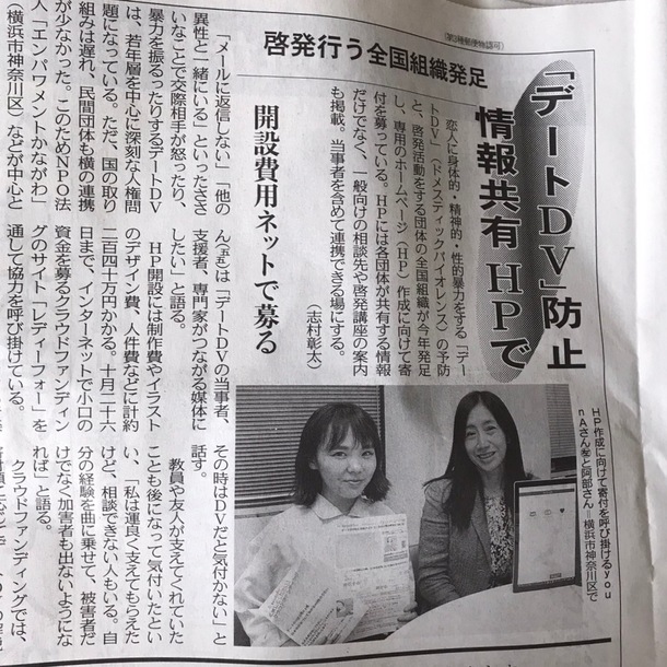 クラウドファンディングでは、寄付額に応じてデートDVの解説が載った冊子や、younAさんの新曲を収録したCDなどをお礼として贈る。阿部さんは「十二月にはHPを公開し、多くの人にデートDVの情報を発信したい」としている。詳細は「レディーフォー デートDV」で検索。