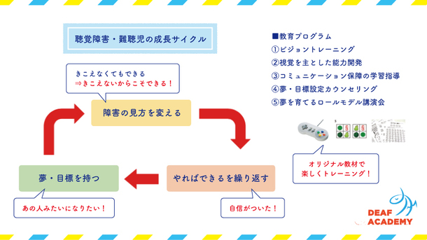 「DEAF ACADEMY」では、ただ勉強を教えるのではなく、聴覚障害・難聴児だからこそ記憶力や速読力と関係の深い「視覚」の能力開発を行い、そこから夢や目標を持つことを支援し、その中にコミュニケーションが保障された環境下で勉強を教える場所を作ります。