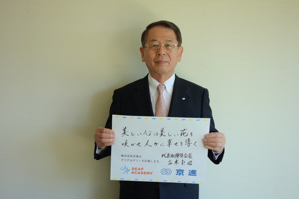 株式会社京進は、「教育を通じた社会貢献」を目的として、学習塾、保育園、英会話教室、日本語学校と、乳幼児から社会人までの教育事業を行っています。また、本業とは別に、開発途上国支援や障がい者福祉の視点での支援を行って来ました。中でも、縁があって1999年からミャンマー国立マンダレーろう学校へ寄付を続けています。職業訓練施設、寄宿舎、インストラクターの養成等、生徒たちの自立を意図したものを贈り、実際に役立っていると聞いています。この度、デフアカデミーが、聴覚障がい児の教育を開始すると伺いました。デフアカデミーの活動が、難聴を持った方たちの自立に、大きく貢献できることを期待し、心から応援したいと思います。