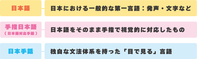 実は、耳が聞こえない人たちの中でも使う言語が異なることで、コミュニケーションの壁ができてしまうことがあります。デフを取り巻く言語は簡単に分けると下図のイメージになると思います。