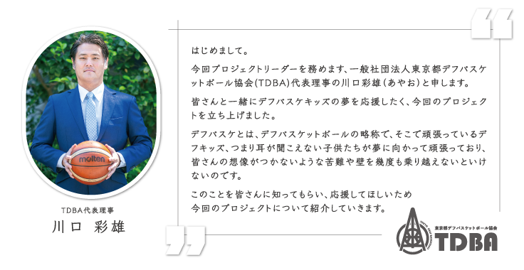 このクラウドファンディングをきっかけにデフバスケが全国に広まり、それを通して、デフに対する理解がもっと深まってほしいと願っています。