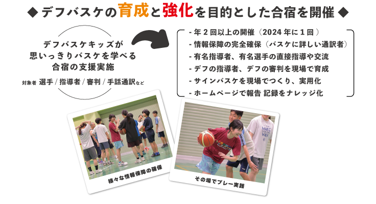 私たちはそれを補うために、デフバスケの育成と強化を目的とした合宿を開催します。そして、デフバスケにおいて強くて勝てるチームをどう作っていくのかを考えていきたいと思っています。
