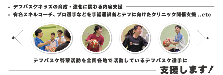 私たちは、聴覚障がい者によるバスケットボール(以下、デフバスケ)をより多くの人に知っていただき、夢を持ってデフバスケをがんばっている子供たちが思い切りバスケットボールを楽しめる環境を作るために活動をしています。