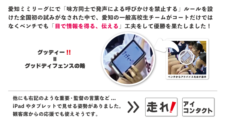 したがって、発声に代わる、もしくは補佐できるコミュニケーション方法を見つけないといけません。それも、攻守の移り変わりが激しい試合中でも迅速に意思を伝えることができるものが求められます。