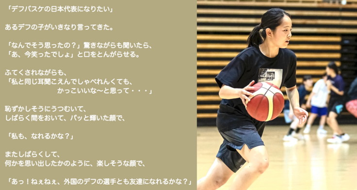 さらに、2024年8月にDIBF主催のデフバスケットボールユースキャンプが日本で初めて開催されます。言語が全く異なる海外のデフバスケキッズを相手に誰一人置いて行くことのない指導方法をしっかり用意して、世界中のデフバスケキッズたちと交流をしてほしいのです。