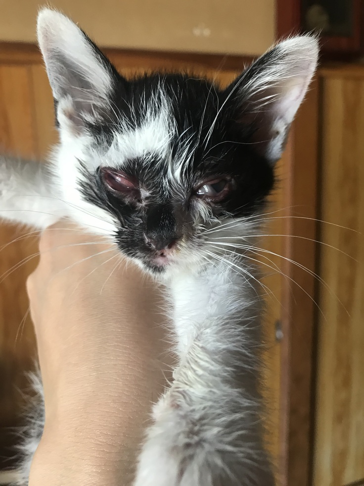 猫風邪で目が腫れ上がり、くしゃみ鼻水まみれの子猫でした。