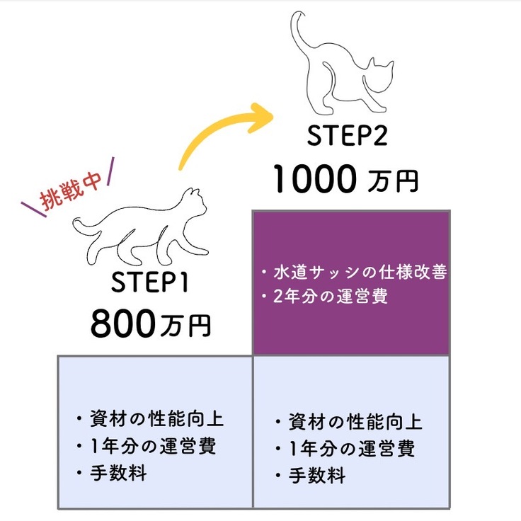 第一目標を超えていただいたご支援は、第一ステップとして資材の性能向上としてより安全で衛生的な環境づくり、団体の活動を安定的に行うために第二ステップとしてプラス2年分の施設の運営費として大切に活用させていただきます。