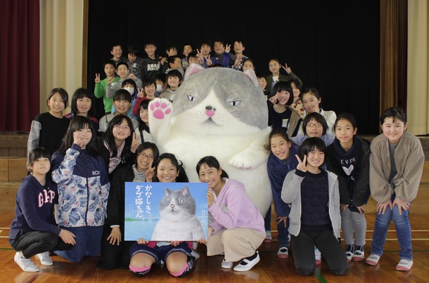 小説家早見和真さんと絵本作家かのうかりんさんが3月15日、発売日の25日に先駆けて、吉田小学校の全6年生28名に絵本「かなしきデブ猫ねこちゃん」を届けました。
