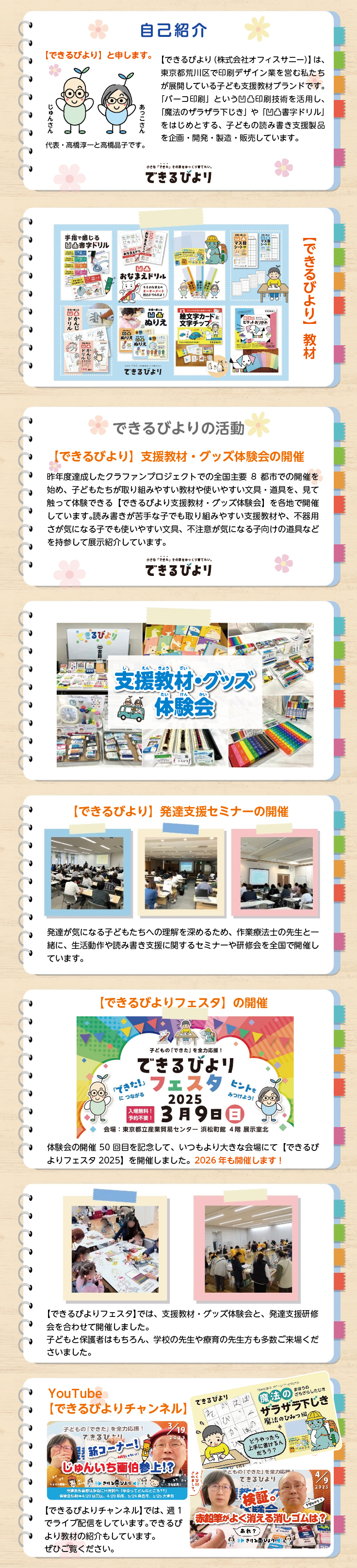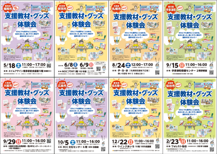 2026年3月31日までに、上記の6都市で「できるびより支援教材・グッズ体験会+無料発達支援研修会」を開催します。