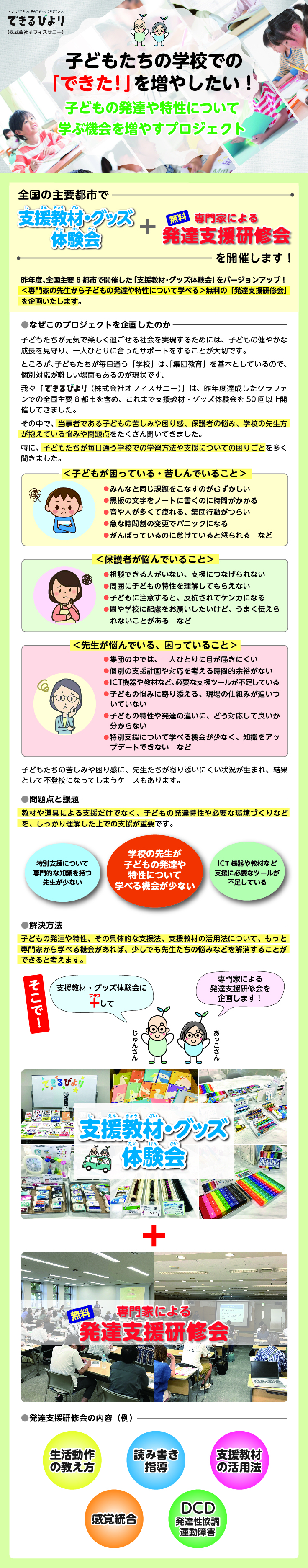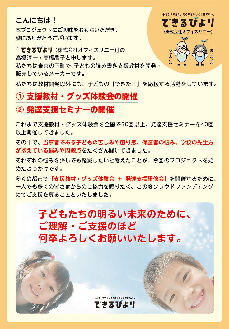 株式会社オフィスサニー(できるびより)が支援教材・グッズ体験会+無料発達支援研修会を開催する。募集した資金は、会場費、講師への謝金、旅費交通費、展示品輸送費、開催宣伝費、クラウドファンディング手数料に使用する。