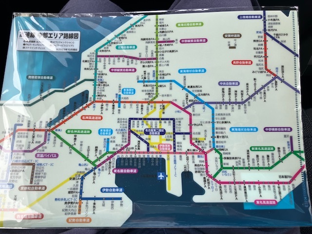 以前、新東名の遠州森町PAで買った高速道路地図のファイルを膝に乗せて、経路を確認しながら走ります。東京は右端からはみ出してます!長い道のりです。