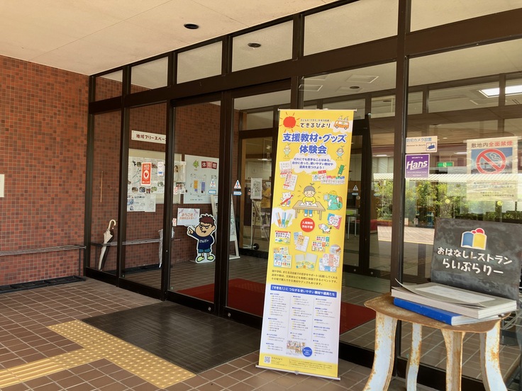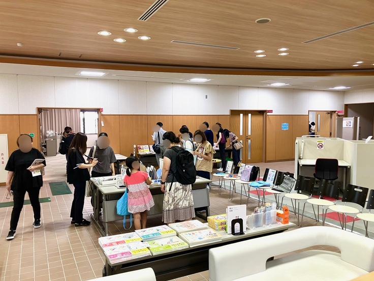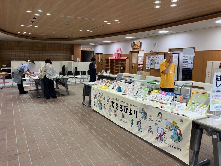 奥に子ども用の図書室がある広々としたスペースに、研修室の長机を出してきて設置。いつものようにできるびよりの教材、使いやすい文具や便利な道具、おススメ書籍、試し書きコーナーなど、長机を12台ほど使って展開しました。