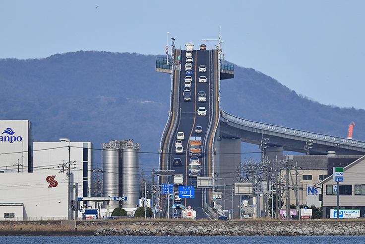 すごい坂!!一体どうなってるの??とお思いでしょうが、島根県松江市の江島から鳥取県境港市を結ぶ橋で、横から見るとこんな感じの長~~い坂です。遠近法で垂直に見えるんですね。おもしろいなぁ~~