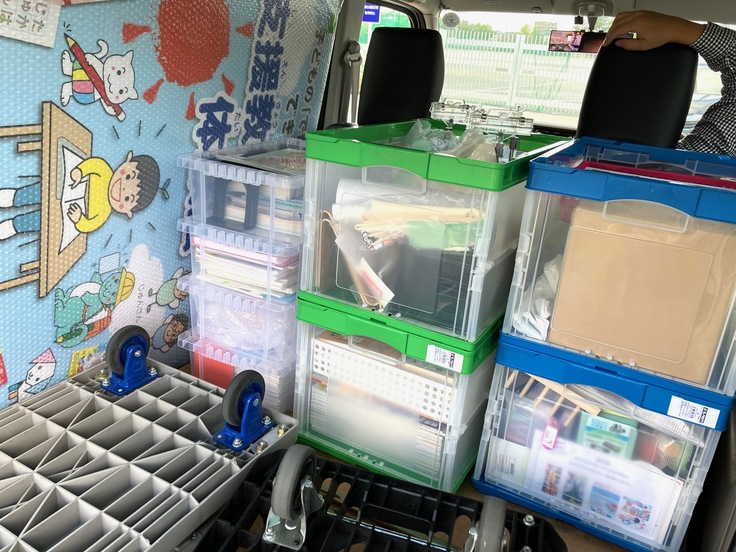 最初はダンボールに荷物を詰めてましたが、だんだん紹介したい書籍も教材も文房具もグッズもどんどん増えてきて、気付いたらスゴイ数の段ボールに!10月くらいからは、モノタロウで購入した折りたたみ式のプラスチックコンテナに変更。これがなかなかの優れモノです!