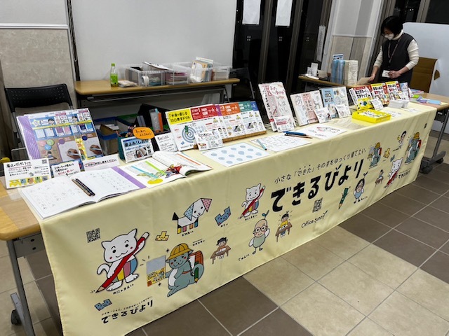 この公園は都立中野支援学校の目の前にあります。夕方遅くには中野支援学校の先生方、近隣の支援学級・支援教室の先生方も多く来場されて、できるびよりの教材や使いやすい文房具・グッズを手に取って、見て、体験していました。
