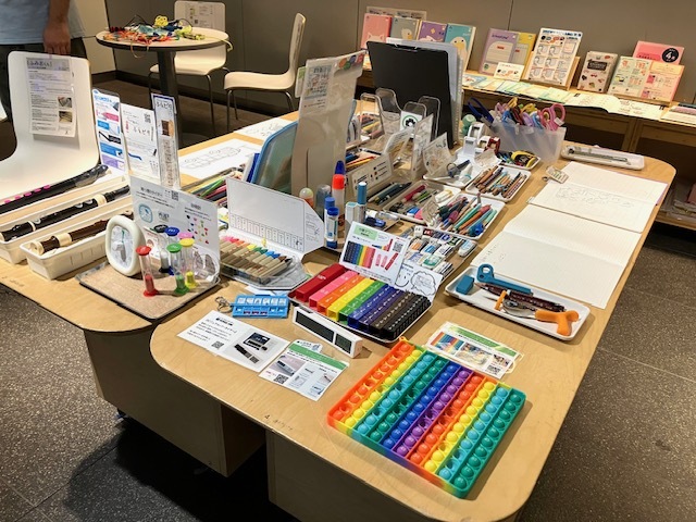 低いテーブルには、文具や道具を陳列。えんぴつと消しゴムの前には、自由に書けるノートを配置。皆さん、えんぴつの書き心地や消しゴムの消し心地を、書いたり消したりして試していました。そして、色のキレイなプッシュポップは札幌でも子どもたちに大人気!表から全部押して、裏から全部押し返す子が多いです(笑)