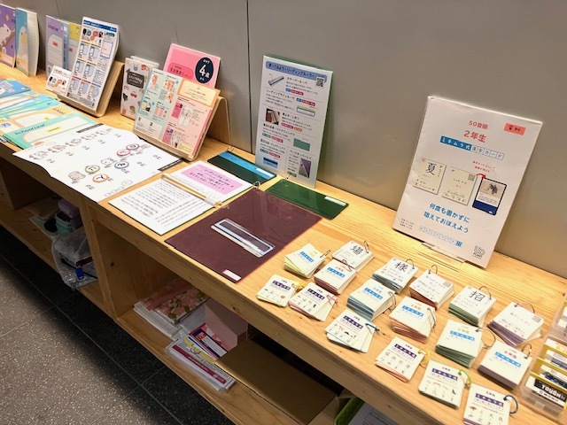 他社の教材・道具も持参。左手奥から<コトリドリル><埼玉福祉会の読書用フィルムとルーラー><ミチムラ式漢字学習>。来場された皆さんは、ひとつひとつ手に取ったり試したりしていました。