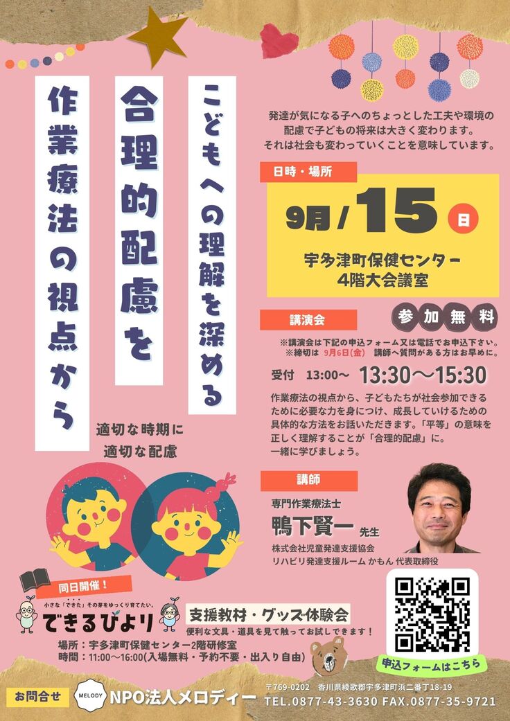 香川県宇多津町での開催では、同会場の別会議室で、宇多津町のNPO法人メロディーさん主催の鴨下先生の研修会があります。