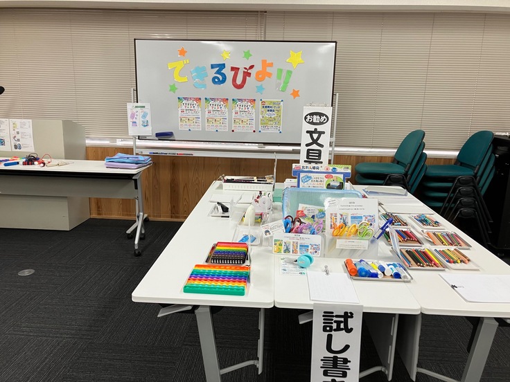 できるびよりの「支援教材・グッズ体験会」は、子どもたちが、実際に教材や文具・道具を見て触って体験して、自分がより使いやすいものを見つけてもらうことが目的です。また大人の支援者さんたちも「こんな便利なものがあるのね!」と知っていただき、支援の現場で適切に活用し、子どもたちの「できた!」をアシストする支援につなげていただけたらと思っています。