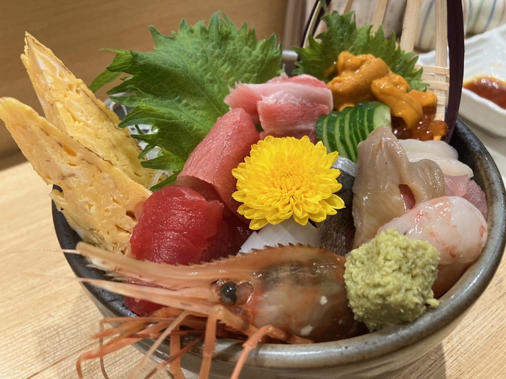 お昼ごはんを食べる時間がなかったので、帰りに仙台駅でお寿司屋さんに入って、海鮮丼をいただきました!美味しかった~~