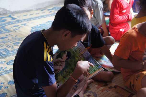 今回、私は、首都ヴィエンチャンから車で3時間ほど北に行った、フアン郡バンドン村で事業を視察しました。「ラオスのこども」は、現在、「学校図書室の地域への展開事業」を実施していますが、ここも事業地のひとつです。この事業は、子どもを含めた地域の人々に本を読む機会を提供することを目的に、学校図書室の開設と運営、その図書室の地域への展開を目指した地域文庫の開設と運営を支援しています。この事業の一環として、村の学校に図書室を開設、さらに昨年7月、村の寄り合い所の空きスペースを利用して地域文庫の開設支援を行いました。村に図書室ができることは、ラオスではこれまでほとんどないことです。