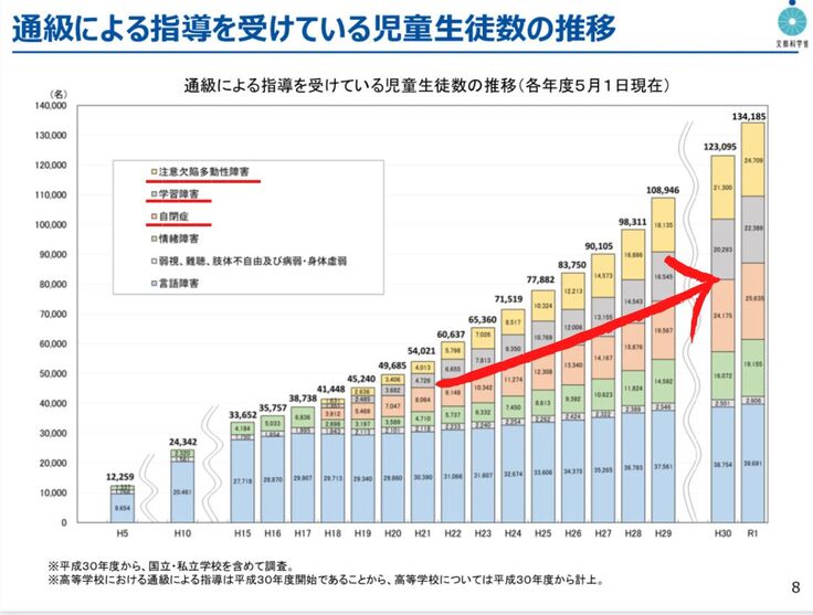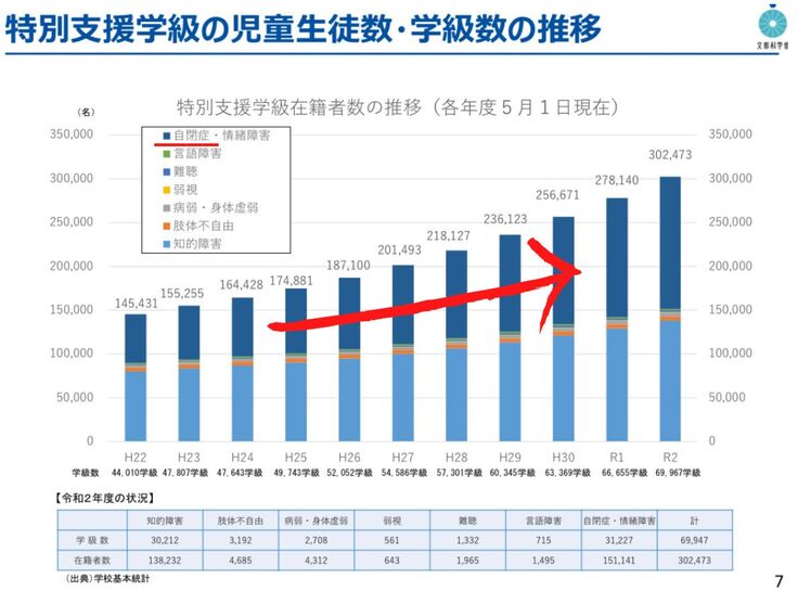 下の1つ目のグラフ濃紺(赤色下線部分)、2つ目のグラフのピンク・灰色・黄色(赤色下線部分)が発達障害のある子どもたちの人数です。