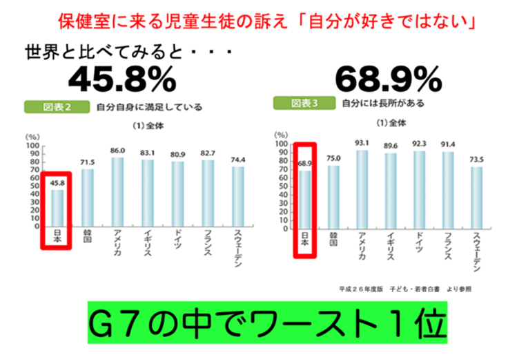 「私なんか・・・」「僕はどうせ・・・」という自分を肯定できていない言葉たちです。保健室にくる子どもたちの多くが、自分が好きではないと話してくれました。