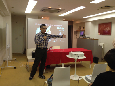 東北の各会場でどのように高座を作ったかというお話もさせていただきましたが、説明会の当日も英会話学校のテーブルに赤い布をかぶせて即席の高座を仕立てました。ホントに落語って大きな機材など無しにゲリラ的にできるのも魅力のひとつですね。