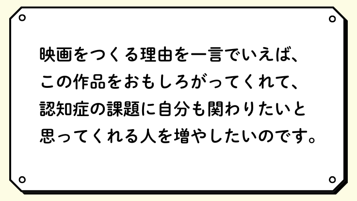 この映画が誰かの気持ちを少し軽くし、認知症に対する景色を、少しやさしく変えていくきっかけになりますように。