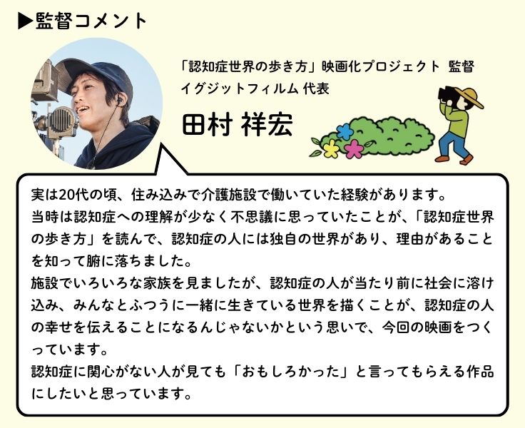 この映画は、認知症に関わるすべての人に、そしてこれからの生き方を考えるすべての人に観ていただきたいと思っています。