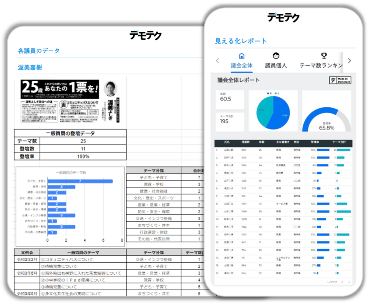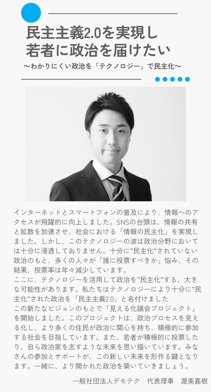 政治家は選挙の際に様々な政策を掲げますが、当選後に政策の実現に向けてどのような活動をしているのか、とても見えづらい現状があります。デモテクは「政治」×「テクノロジー」で「わかりやすい政治」を実現し、投票率の向上と活動実績に基づく投票の実現を目指します。それが私たちが目指す「議会の見える化」であり「民主主義2.0」の姿です。