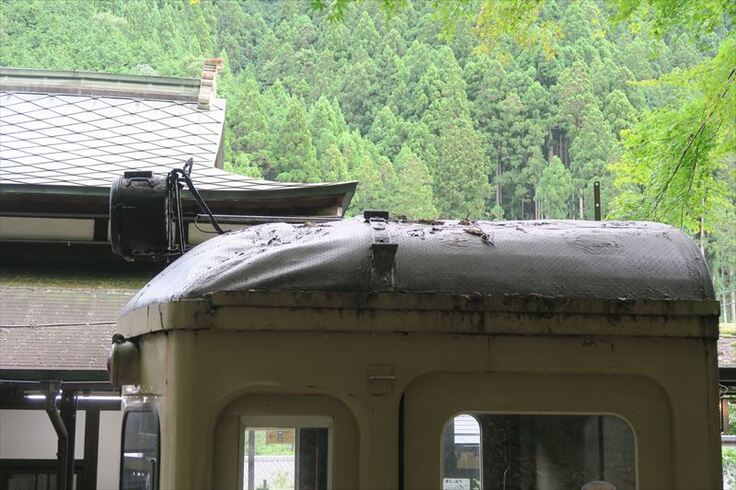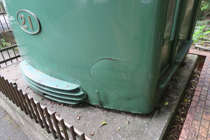21号車は運行終了の翌年、1995(平成7)年8月より前頭部をカットモデルとして鞍馬駅前に展示しております。幾度か修復してまいりましたが、約30年もの間、雨ざらし状態での保存であるため痛みが激しく、最近は木製の屋根が腐ったり、外板が腐食したりと老朽化が著しい状態となっています。