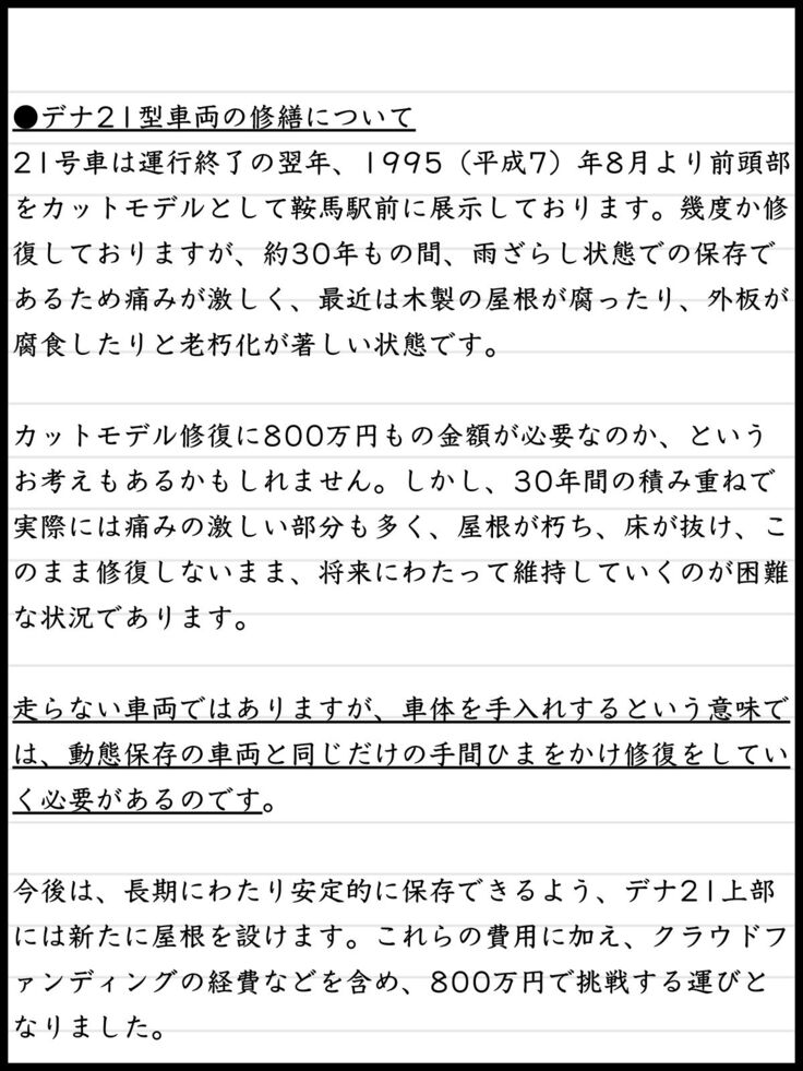 皆様からのご支援が、デナ21型車両の末長い保存に繋がるとともに、未来にその歴史を伝えるための一歩になります。