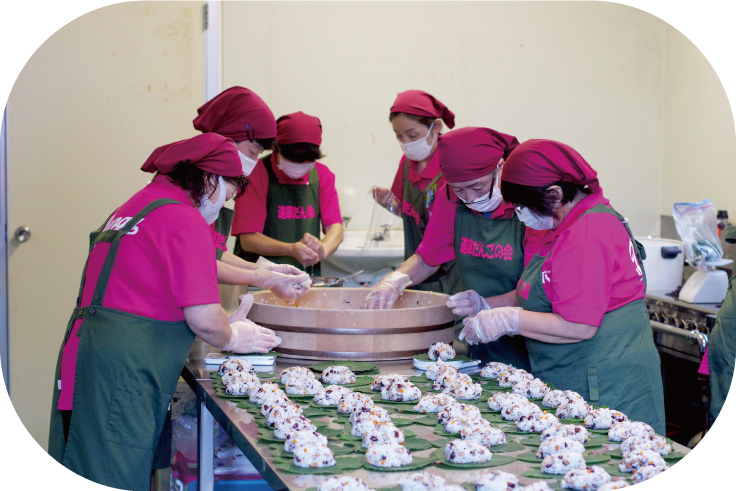 もともとは、お団子作りをメインに、地区内外のお祭りやイベントに出店して、五平餅、草だんご、おはぎ等を販売してきました。昔の暮らしを調べる福井市内の小学生向けには、おはぎ作りを教えたりもしてきました。