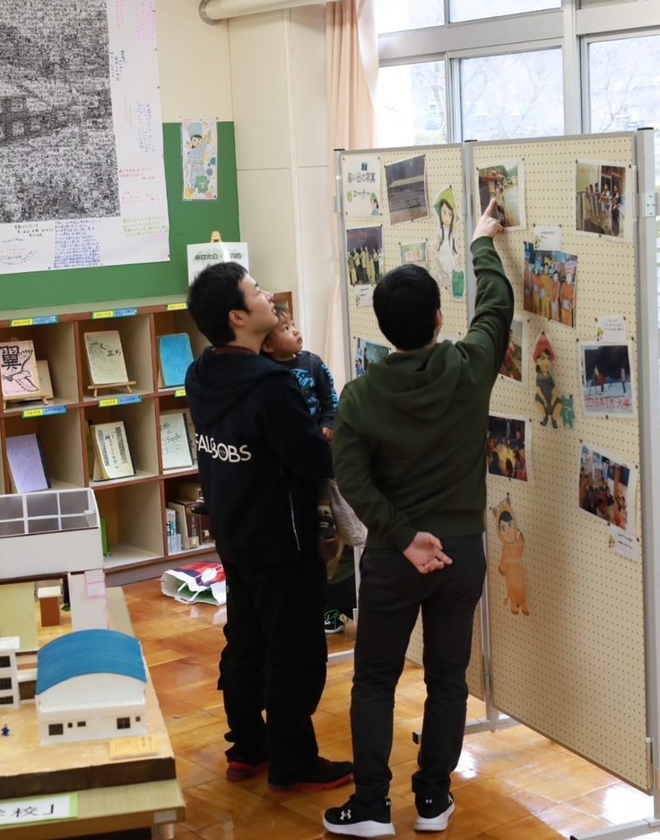 後ろの壁には、昔の木造校舎を再現したデジタルアートが張り出されており、そこにたくさんの人が寄せ書きをしています。