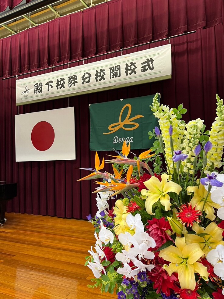 国旗の横に掲げた緑色の旗が、新しい「絆分校」の校旗です。