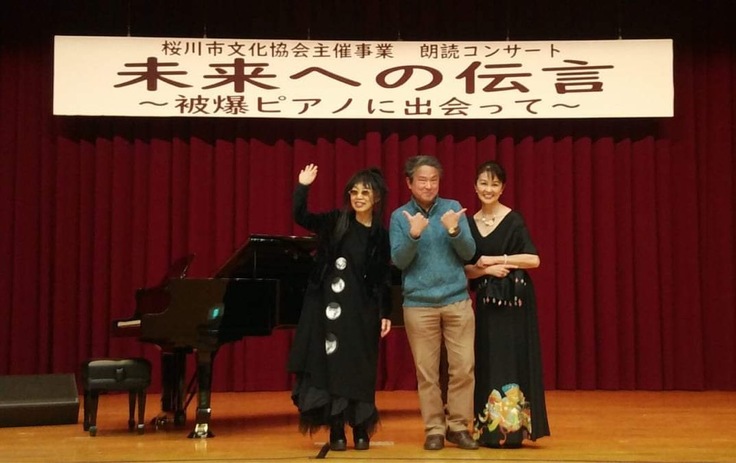 2005年被爆ピアノコンサートが初めて東京で行われたとき、ピアノのことを朗読したのがきっかけ! 被爆地から2キロ圏内で奇跡的に生き残ったピアノは突き刺さったガラスの跡で痛々しい姿でしたが、その音色は、私たちに生きる力を与えてくれるような凛とした力強い音色でした。その後、コンサートに来てくださった歌舞伎音楽の杵屋浄貢さんから谷川俊太郎さんの詩に曲をつけた「原爆を裁く」という作品を送っていただきました。