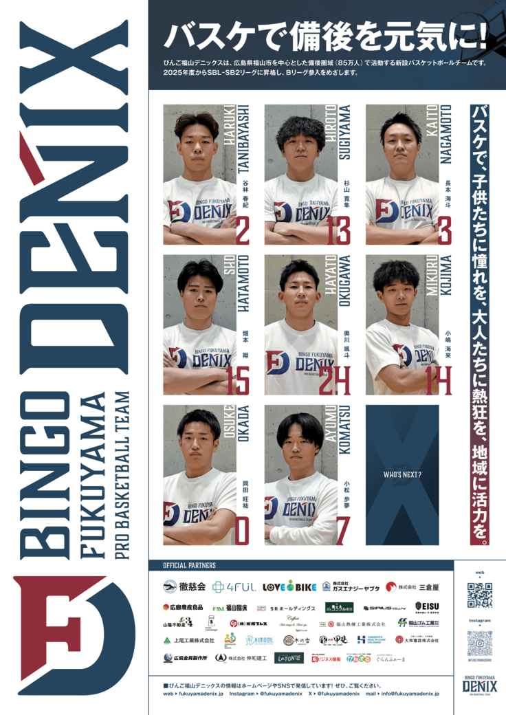 びんご福山デニックスは、広島県福山市を中心とした備後圏域(85万人)で活動する新設バスケットボールチームです。2025年度からSBL-SB2リーグに昇格し、2028年度のBリーグ参入をめざします。